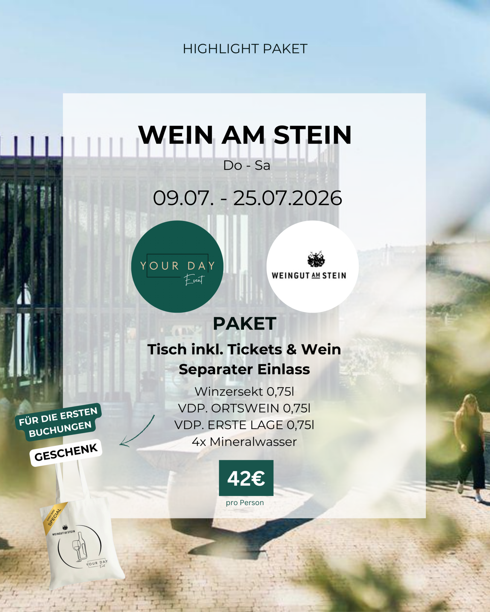 Mit dem Kauf unserer Pakete erhältst du folgende Wein am Stein Inklusivleistungen: